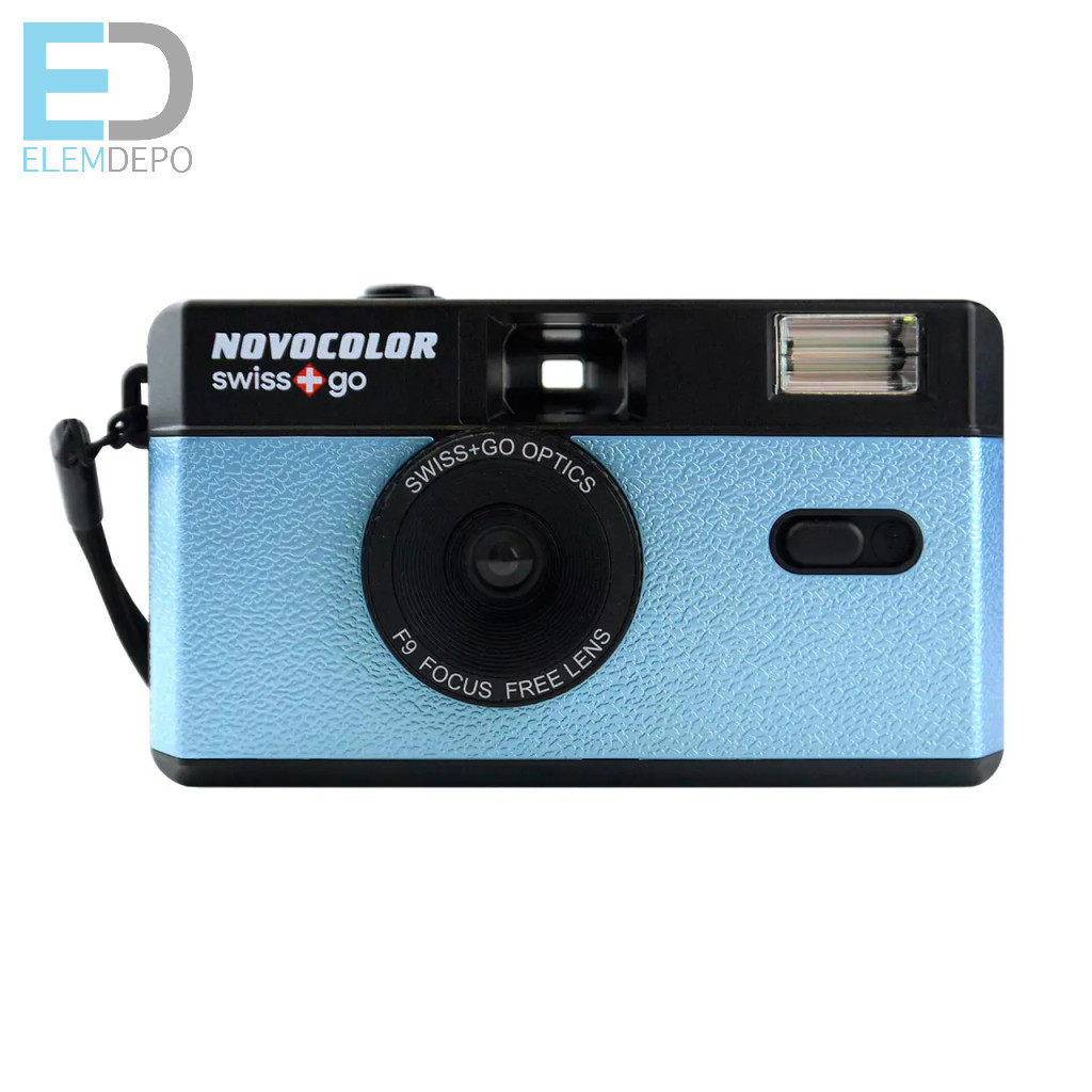 Novocolor swiss+go 35 mm-es újrafelhasználható analóg fényképezőgép vakuval + fekete tokkal és szíjjal (kék )